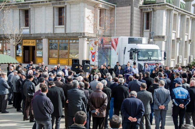 Toplanan yardımlar yola çıkmadan Cuma Namazı sonrası Şehitler Cami bahçesinde bir tören düzenlendi. Törene cami cemaati yanısıra Kaymakam Engin Aksakal, Belediye Başkanı Lokman Ertürk, şehit aileleri ve gaziler katıldı.
