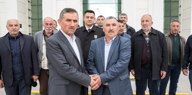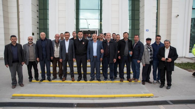 Kura çekimi ile muhtar seçilen adaylar İlçe Seçim Kurulu’nun bulunduğu Adliye binası önünde tebrikleri kabul etti, toplu fotoğraf çekindiler.