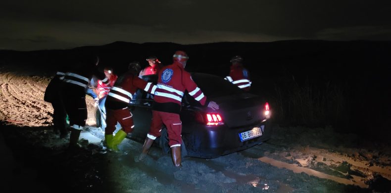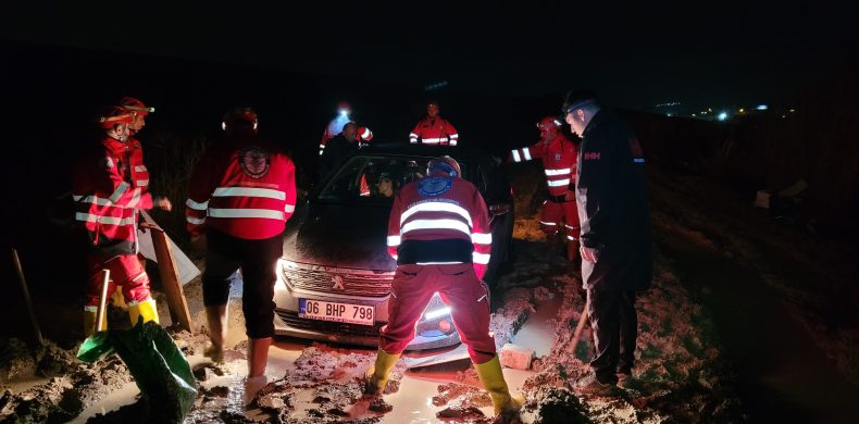 Bölgeye giden Arama Kurtarma Ekibi araçlarında bekleyen aileye ulaştı. Çamura saplanan aracı kurtarmak mümkün olmayınca engelli kızı sırtlarına alarak bataklığa dönen tarlalardan geçerek yakındaki Saraykent Sanayi Sitesinde bekleyen yakınlarına teslim etti.