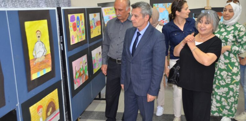 Okul Müdürü Murat Sarıbaş ve projede görev alan öğretmenlerle birlikte okulun toplantı salonunda açılışı yapılan sergide 55 resim sergileniyor.