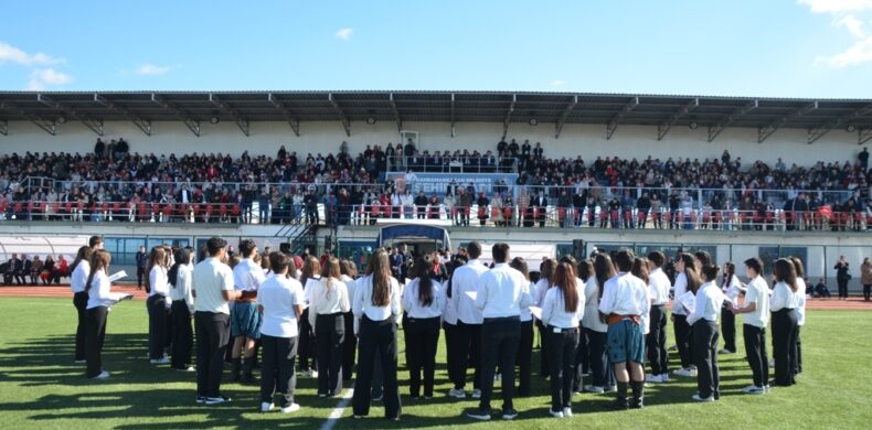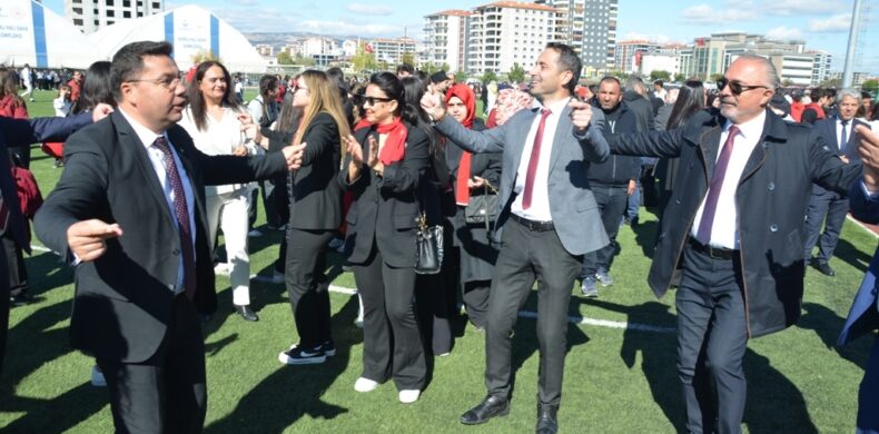 Beğeniyle izlenen ve sık sık alkışlarla kesilen kutlamalarda okul 566 öğrencisi ve tüm öğretmenleriyle tam kadro sahadaydı.